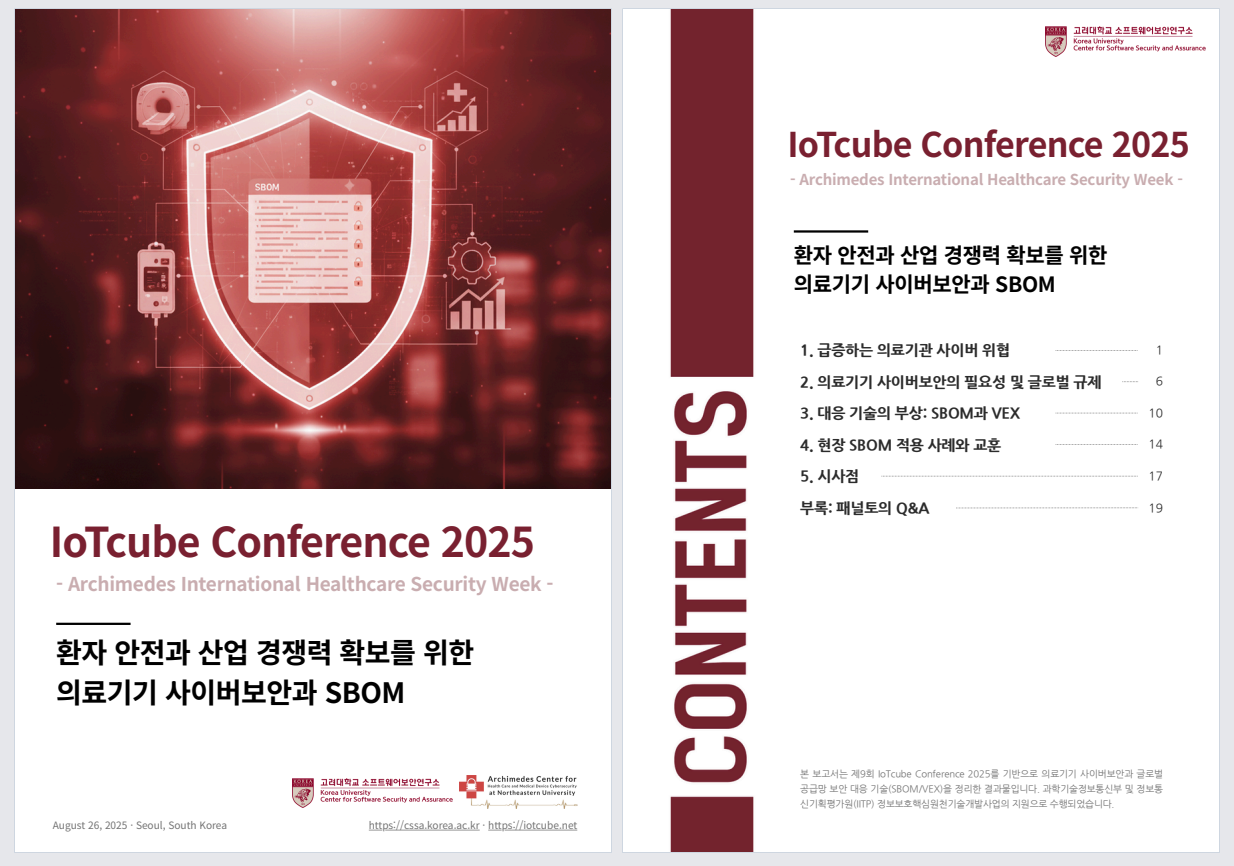 고려대 SW보안연구소는 미국 노스이스턴대 Archimedes Center for Healthcare and Medical Device Cybersecurity와 함께 IoTcube Conference 2025의 핵심 논의와 기술 인사이트를 담은 「환자 안전과 산업 경쟁력 확보를 위한 의료기기 사이버보안과 SBOM」 보고서를 공개했습니다.