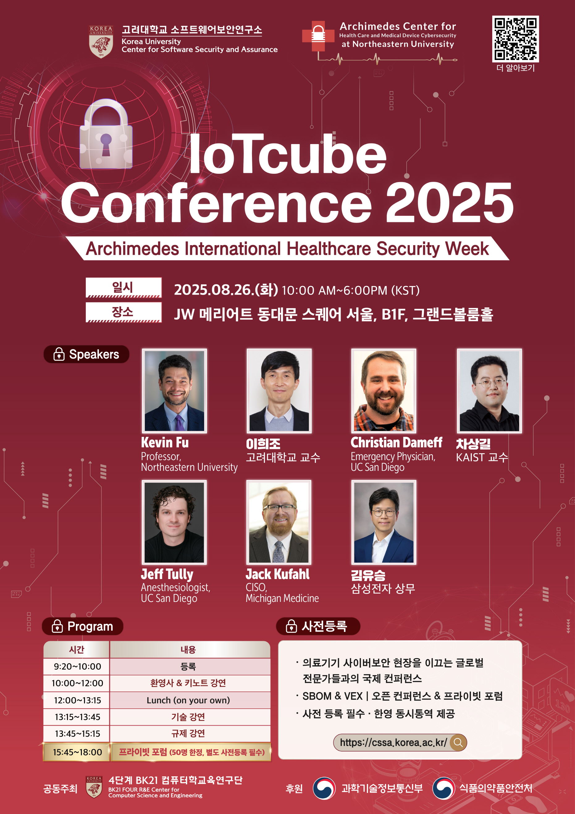 올해 9회째를 맞이한 IoTcube(아이오티큐브) 컨퍼런스는 사이버보안 문제를 탐구하는 신뢰받는 포럼으로 자리 잡았습니다. 2025년 행사는 고려대학교와 노스이스턴대학교의 Archimedes Center for Healthcare and Medical Device Cybersecurity가 공동 주최하며 의료기기 사이버보안에 초점을 맞춥니다.
